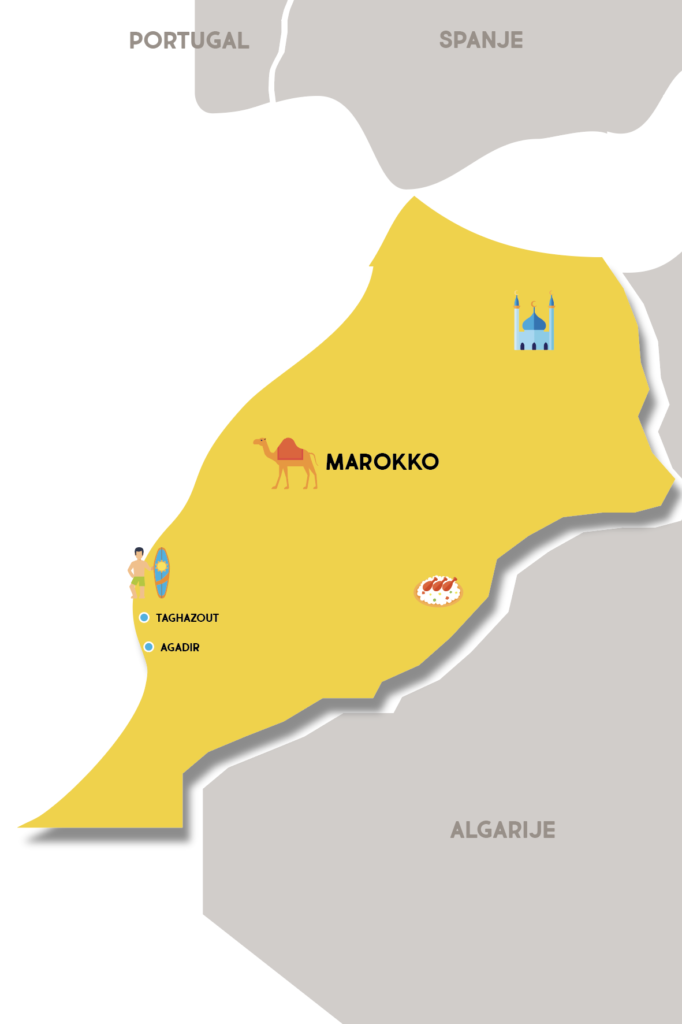 Marokko ligt in Noord-Afrika, relatief dichtbij Europa, maar het voelt als een compleet andere wereld. Het is een land vol kleur, cultuur en contrasten. Van levendige markten en eeuwenoude medina’s tot uitgestrekte stranden en ruige bergen, Marokko heeft het allemaal. Je vindt er een mix van Arabische, Berberse en Franse invloeden, die je terugziet in het eten, de architectuur en de manier van leven. Tijdens Kickstart Marokko verblijf je tussen Agadir en Taghazout, aan de zuidwestkust van het land. Deze regio is perfect voor een relaxte start van je reis: zon, zee, surfen en een dosis cultuur.