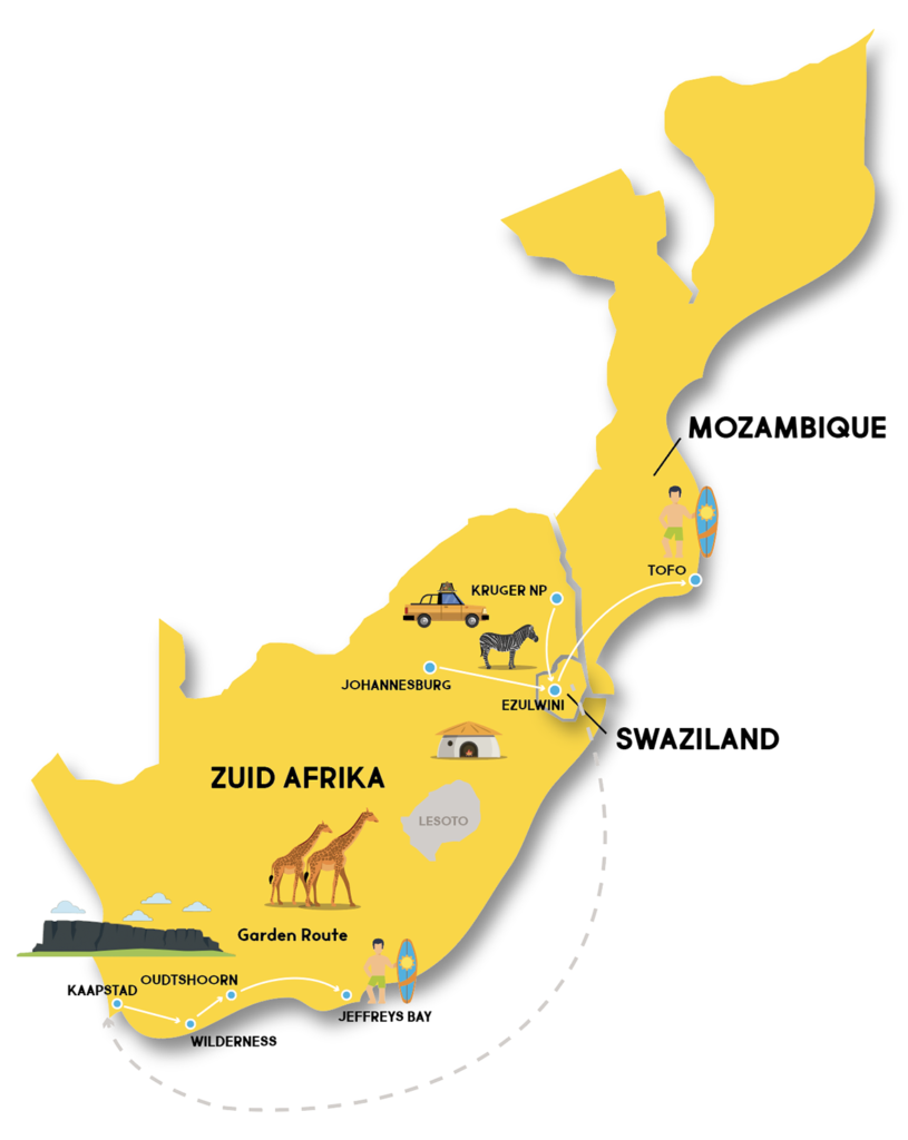 Tijdens deze unieke reis van Kruger tot Kaapstad ontdek je het beste van Zuid-Afrika, het buurland Swaziland en Mozambique. Van safari’s in het wereldberoemde Kruger National Park tot vrijwilligerswerk in de groene heuvels van de Ezulwini Valley en de stranden van Mozambique, deze reis is één groot avontuur.