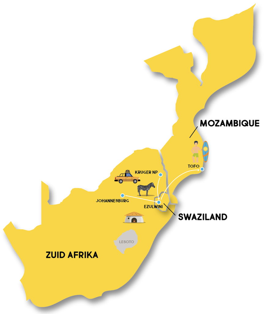 Tijdens deze reis ontdek je drie totaal verschillende landen in zuidelijk Afrika: Zuid-Afrika, Swaziland en Mozambique. Van safari’s in het wereldberoemde Kruger National Park, tot vrijwilligerswerk in de groene heuvels van de Ezulwini Valley, en van tropische stranden tot duiken met walvishaaien, deze reis is een unieke mix van natuur, cultuur en avontuur.